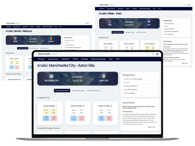 Scordati per sempre i fogli Excel complicati e impossibili da gestire, i software obsoleti che non si aprono nemmeno o che richiedono ore solo per capire come cavolo funzionano. Con Sbancobet hai finalmente tutto ciò che ti serve racchiuso in un’unica interfaccia super intuitiva e potente, per trasformare migliaia di dati storici, statistiche dettagliate e trend nascosti in un vantaggio statistico reale e misurabile che puoi sfruttare concretamente nel betting e nel trading sportivo.